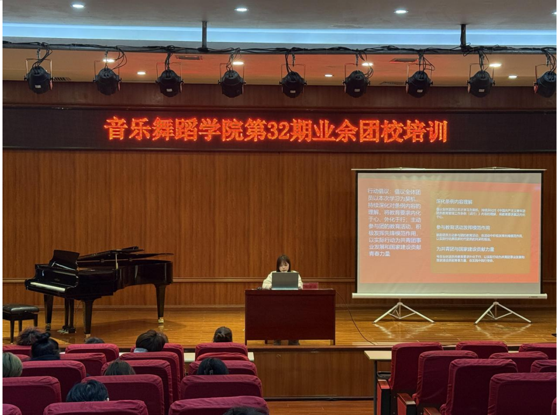 为深入推进团员思想教育工作,进一步筑牢青年学子跟党走的信念根基,10月23日,音乐舞蹈学院团委在学院六楼音乐厅组织开展了第32期业余团校培训专题讲座(四)。院团委组织部副部长陆清清担任主讲,全体参训团员参会。