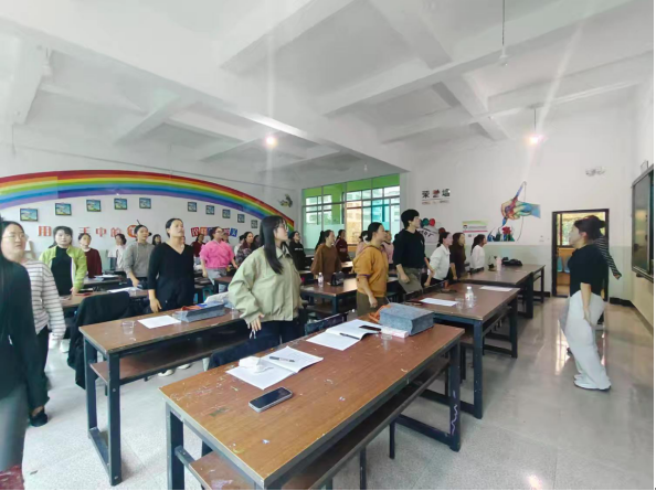 培训中,我院美育教师团队分学段开展课桌舞教学。小学组由黄河老师授课,她立足小学生认知特点,先从基础要点切入,聚焦“里外”方向区分这一核心难点,通过分步示范、互动纠错,帮助老师们快速厘清动作方位逻辑,夯实教学基础。初中组由苏桂玉老师授课,她以《色彩魅力》等三首曲目为例,拆解动作并分享引导技巧,帮助参训教师探索适合初中生的美育模式。