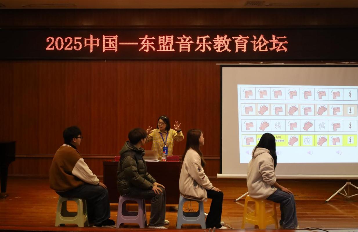 本网讯 2025年11月7日上午,音乐舞蹈学院六楼音乐厅内掌声雷动、互动热烈,马来西亚苏丹伊德里斯教育大学华裔教授黄慧怡(Wong HueYi)博士为我院学子带来了一场沉浸式奥尔夫音乐教学公开课,让同学们在亲身参与中领略了这一经典教学法的独特魅力。此次前来参加论坛的多位国内外嘉宾也到现场观摩。