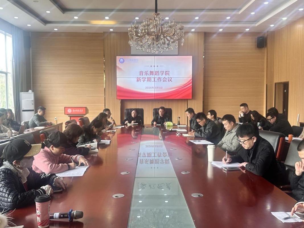 为全面落实学校新学期工作部署,统筹推进学院师德师风建设、教育教学、科研、学科专业发展、艺术实践与艺术创作、申硕等重点工作,3月5日下午,音乐舞蹈学院在逸夫楼六楼会议室召开2026年春季学期初工作会。会议由副院长荆彦超主持,全体教师参会。