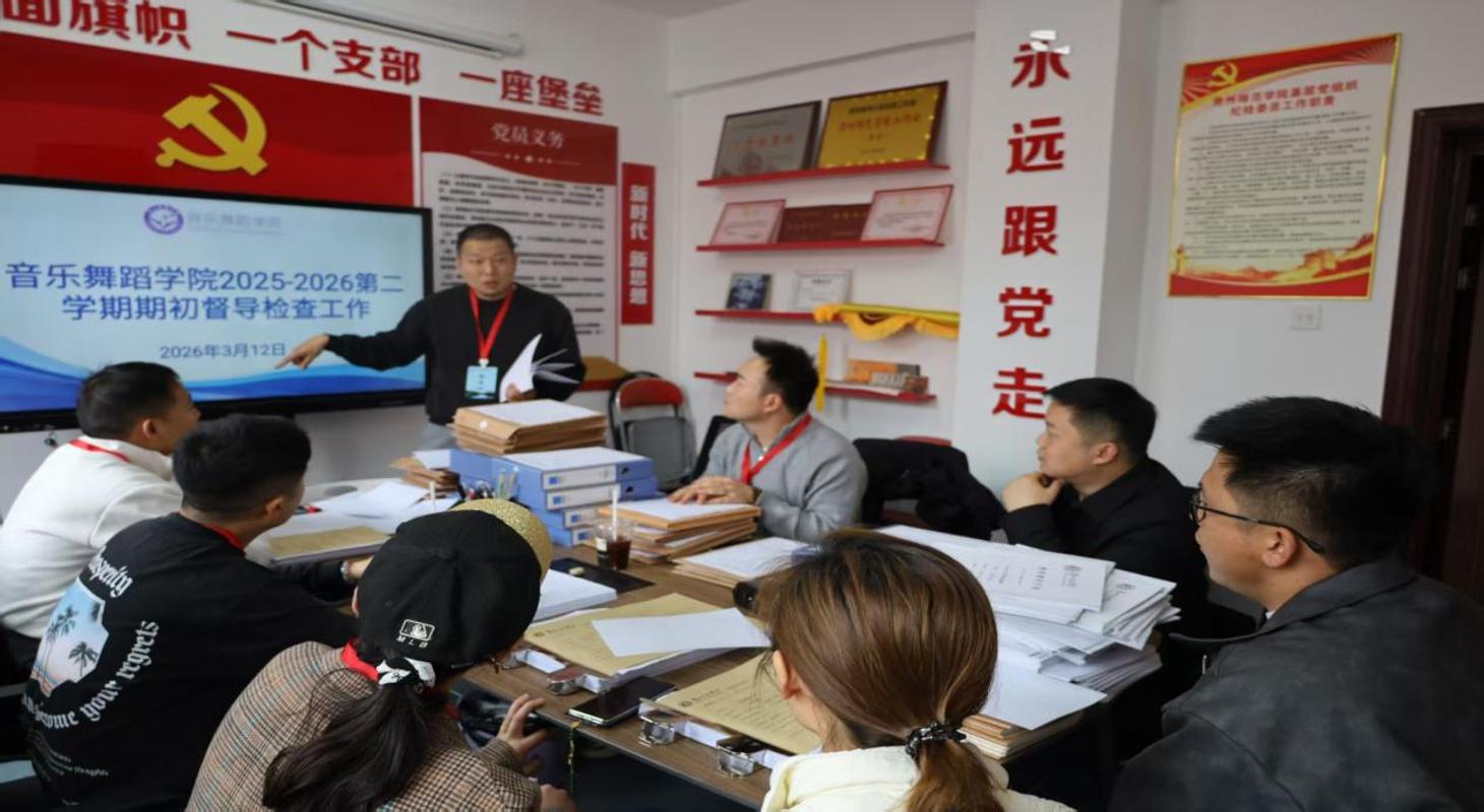 本网讯 3月12日下午,音乐舞蹈学院教学督导委员会全体成员在学院党员活动室召开2026年春季学期督导专项工作会议,并集中检查上学期试卷、2026届毕业论文(设计)推进情况及本年度毕业实习材料归档质量。